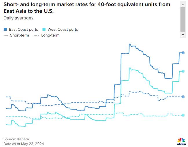 2024年初,紅海緊張局勢(shì)引發(fā)現(xiàn)貨運(yùn)費(fèi)急劇上升,隨后有所下降,但自4月底以來,通往美國(guó)海岸航線的現(xiàn)貨運(yùn)費(fèi)開始飆升,平均漲幅高達(dá)1500美元,運(yùn)營(yíng)商收取的最高合同價(jià)格可以達(dá)到一個(gè)月前的兩倍多。